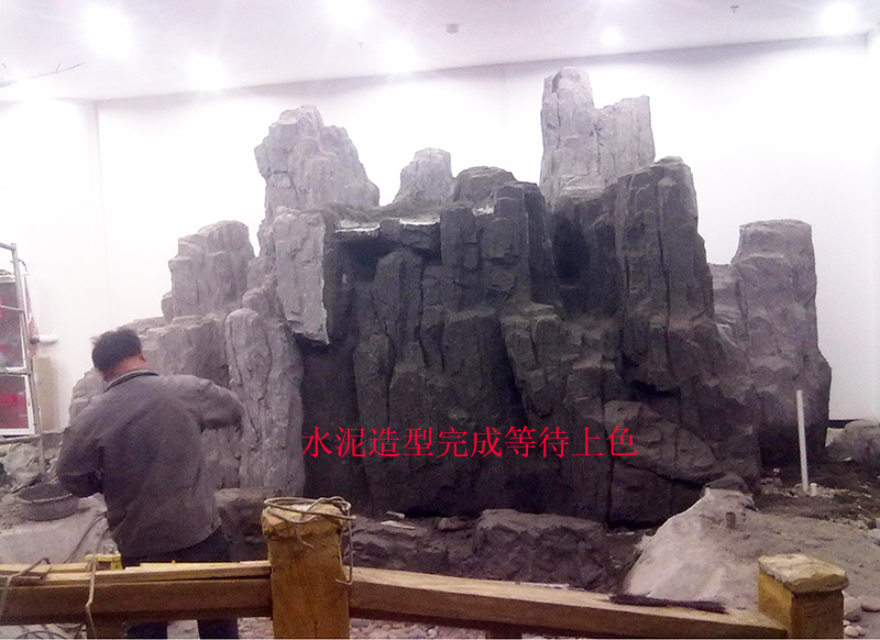4,設(shè)色。在塑面水分未干透時進(jìn)行,基本色調(diào)用顏料粉和水泥加水拌勻,逐層灑染。在石縫孔洞或陰角部位略灑稍深的色調(diào),待塑面九成干時,在凹陷處灑上少許綠、黑或白色等大小、疏密不同的斑點(diǎn),以增強(qiáng)立體感和自然感。