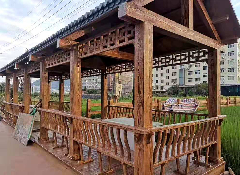 為了彌補實木的不足之處,便出現(xiàn)了現(xiàn)代水泥仿木亭、仿木長廊、水泥仿木紋欄桿等水泥仿木景觀工程。水泥仿木紋工藝——這種工藝凝固中國繪畫和文學(xué),所以水泥工藝充滿著詩情畫意景觀建筑空間藝術(shù)。